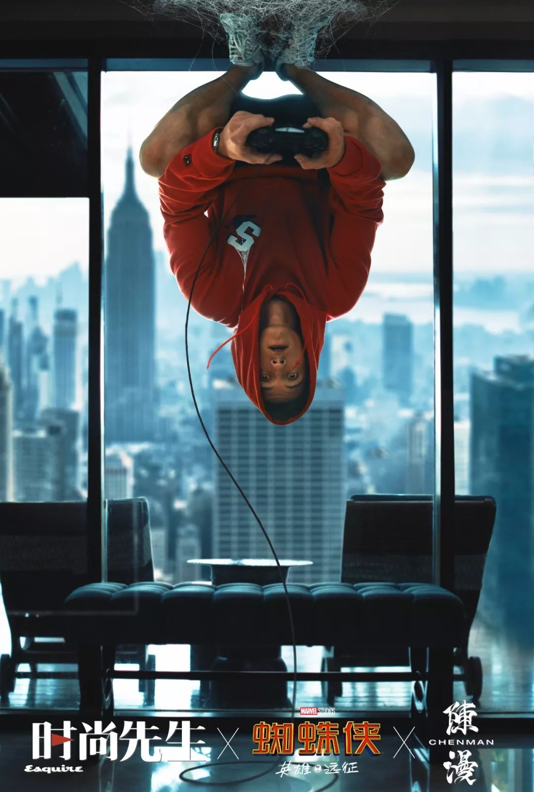 他穿着 Polo 衫戴着框架眼镜,双肘架在腿上,整个人微微前倾,身体里仿佛绷着根弦——比起银幕上总是揉着一头乱发的样子,他看起来要成熟些。凡事他都有自己的主意,比如采访,他希望“在户外,不要有旁人”,于是聊到 20 分钟后,我才看到他的经纪人蹑手蹑脚地轻轻上楼,在五米开外的地方坐下。又比如拍摄时,摄影师希望他试一个拿着蜘蛛侠面罩的动作,他立刻摇头,“不,我不想拿”,毫无回旋的余地。