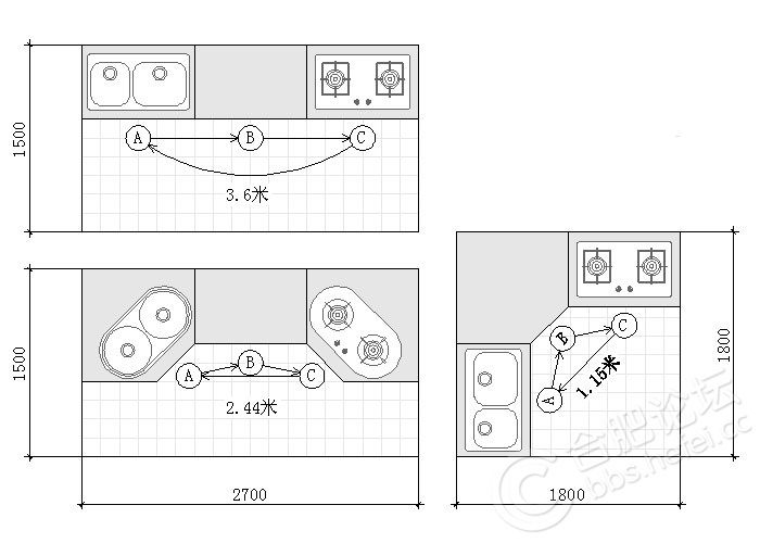 不好的设计带来的坏处是:空间占用大,利用面积不高,而且做饭容易手忙脚乱。