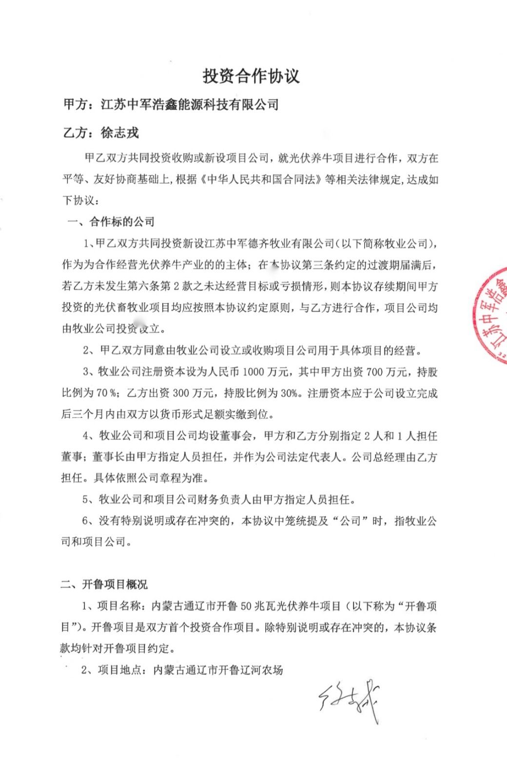 1、 浩鑫出资700万,我出300万,共同成立一个负责为所有光伏项目做农业配套的公司,叫德齐牧业(名字还是我起的,典出《论语》“道之以政,齐之以刑,民免而无耻;道之以德,齐之以礼,民耻且格。”后来的事态发展表明,这个名字实在是个绝妙的反讽);