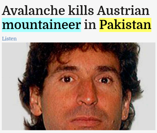 当时,这个七人小组在海拔约5300米的Ishkoman山谷处遇上雪崩。巴军方直升机找到了除巴基斯坦登山者之外的所有登山者,巴基斯坦登山者被推定死亡。