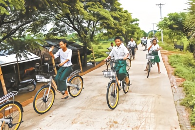 缅甸一所乡村学校的学生骑着改造后的共享单车上下学 供图/视觉中国