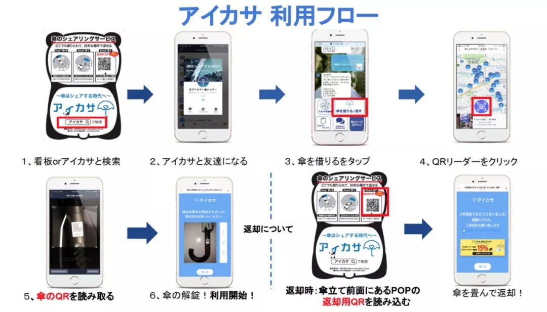 日本的共享雨伞iKasa使用模式简单便捷,只要在常用的社交App「Line」上添加iKasa为好友,通过扫描二维码取得雨伞的开锁密码,归还时把雨伞收好放回固定的伞架,再扫描伞架上的归还二维码即可。租借不用缴付押金,一天的租金是70日元、一个月420日元,价格低廉。所以对消费者来说,并没有太多使用上的门槛。