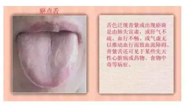舌象:舌边、舌尖有黑色瘀点或瘀斑,整个舌质发暗、发紫或为青紫舌;舌下静脉曲张。