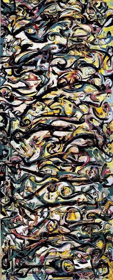 《壁画》(1943)具有早期抽象表现主义的诸多特征,在这个阶段,它还是画家将颜料运用到画布上时所留下的原始物理痕迹或“姿态”。后来的风格更加清静、更加深沉,但在最初,波洛克的行动绘画奠定了此次运动的基础。一种暴烈的、本能的力量从身体深处喷发出来,以颜料的形式喷射到画布上,他的作品就这样产生了。一幅像《壁画》这样的作品就是结果。它既是抽象的,又是富有表现力的。一堆旋转着的厚重白色颜料像落下的波浪一样撞到了画布上。它被鲜艳的黄色色块打碎,而后者又被随意画上却均匀分布的黑色和绿色垂直线所分割。没有哪个部分是目光应该被吸引的中心区域:这是一幅“满布的”画。想象一下 100 个生鸡蛋被扔到布满涂鸦的墙上的情景,你就能猜到《壁画》大概的样子了。