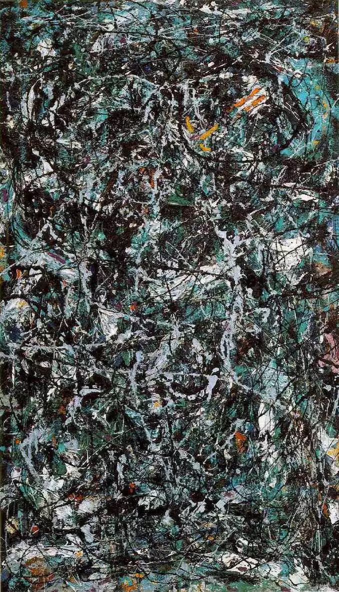 深绿色的背景明显冒着泡泡,这是波洛克用碎石做成的隆起的轮廓,以此为画布打底。他在这片粗砺的风景上滴入了白色颜料,点缀以蜘蛛网一般的黑色线条,极细的笔触在画面上轻盈地舞蹈。偶尔有小块的粉色、黄色或橙色在意想不到的地方出现,就像山楂树篱上挂着的破衣服。这些泼溅的颜料装饰着一个被波洛克用调色刀和刷子刮擦得凹凸不平的表面。整幅画彻底抽象,且毫无疑问地富有表现力:仿佛一阵狂怒在画布上翻涌。