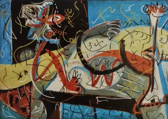 在蒙德里安的提点下,她做出了正确的判断。杰克逊·波洛克(1912-1956)所画的《速记人物》并非一张抽象画,也没有任何迹象显示他后来会发明滴画法并以之成名。这幅画在很大程度上应归功于毕加索、马蒂斯和米罗——波洛克最崇拜的三位欧洲画家。《速记人物》描绘了两个意大利面似的形象坐在一张小桌子上,面对彼此。他们正进行激烈的讨论,红棕色的胳膊疯狂地打着手势,胳膊切入桌子的红色边缘和画面的淡蓝色背景。波洛克将桌子向观者倾斜,勾勒出两个拉长了的形象,这种方法显示出毕加索的影响。而这个美国人对米罗的致敬可以从潦草书写的字母(“速记”是指以快速记录的方法书写的过程)以及布满画面的随意形状中看出。它们模仿了米罗的自动主义——他那意识流的超现实主义绘画技巧。从波洛克运用野兽派式的明亮色彩中,我们可以看到马蒂斯的影子。