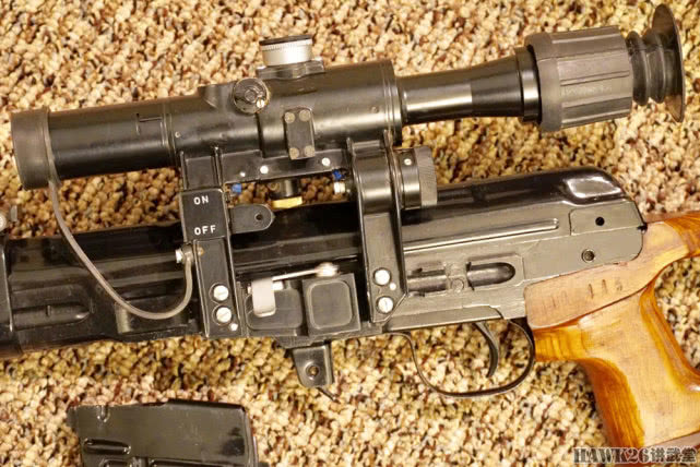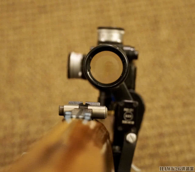 固定在机匣左侧的瞄准镜,前方有可拉出的遮阳罩,目镜上有橡胶眼罩。采用纽扣电池供电,为分划板提供照明。前镜架有电源开关,有英文标识。镜座有锁定杆,可以进行快速安装或拆卸。机匣侧面的安装座可以看到明显的加工痕迹。