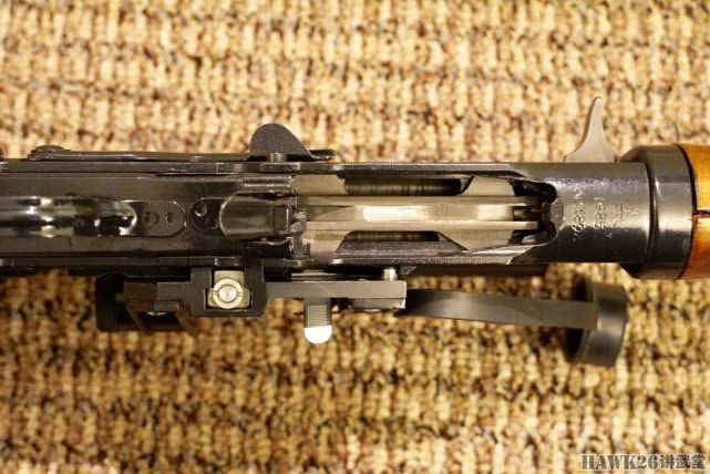 KUN特别展示了一下卸下弹匣后,弹匣仓内部的样子,能够看到已经闭锁的枪机组件,这个角度的照片确实很少见。注意弹匣仓前部的制造厂家是三角标识,以及制造年代——1985年,这支枪的岁数比不少朋友都要大。这个细节其实挺有意思的,步枪型号是NDM-86,却是1985年制造的。