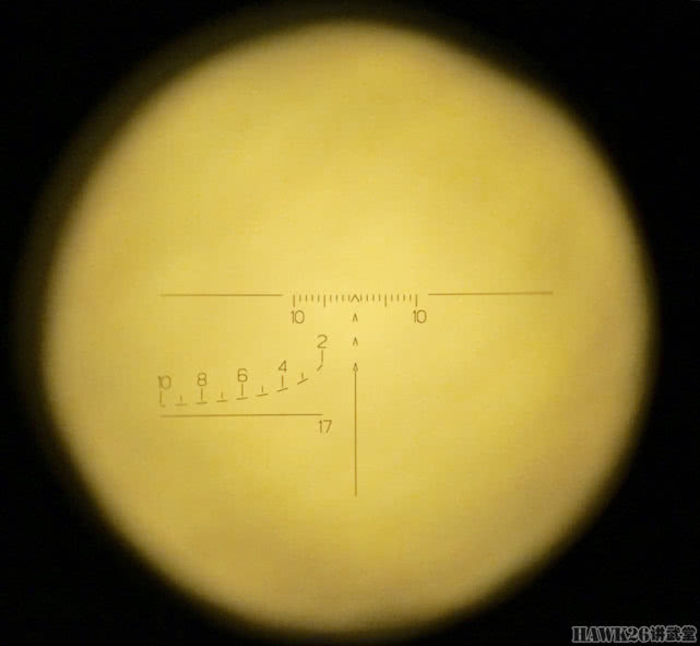 瞄准镜分划板就是这样的,并没有常见的十字线,而是用倒V标识瞄准点。垂直方向有四个瞄准点,当弹道补偿设在1000米时,最上方的倒V形标明的是1000米的瞄准点,下面三个瞄准点分别对应1100米、1200米、1300米。左侧的弧形是简易测距标线,下面的17表示对应1.7米的站立目标。将这个测距标线对准站立的目标,其高度符合哪个标线位置,则上方就是目标距离。