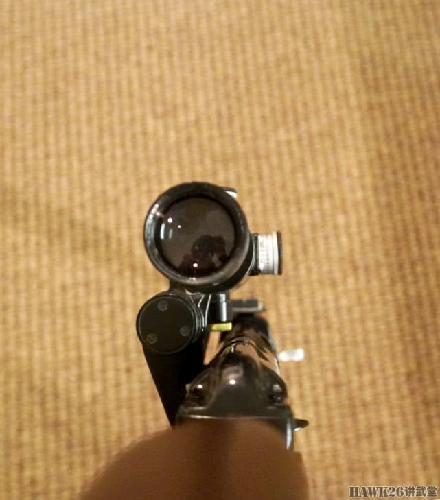 从前方看瞄准镜,能看到物镜上反射的KUN拿着相机的样子。这支步枪采用传统的弧形表尺、U形照门,只是备用手段,平时主要还是用瞄准镜进行射击。