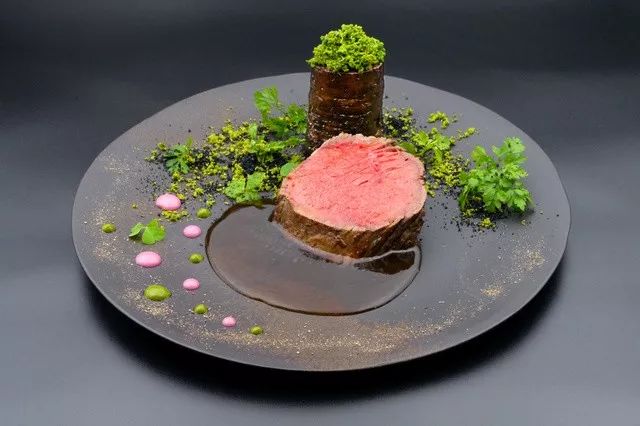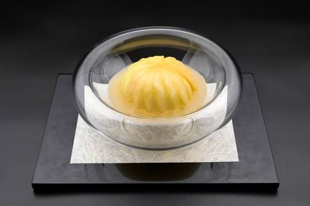 前菜是大阪产的泉州水茄、烤玉米做成茶碗蒸状。主菜用竹炭和青花鱼调味,用烤箱烤的但马牛。最后的点心是熊本的白桃和使用鹿儿岛的芒果制作的茶点。