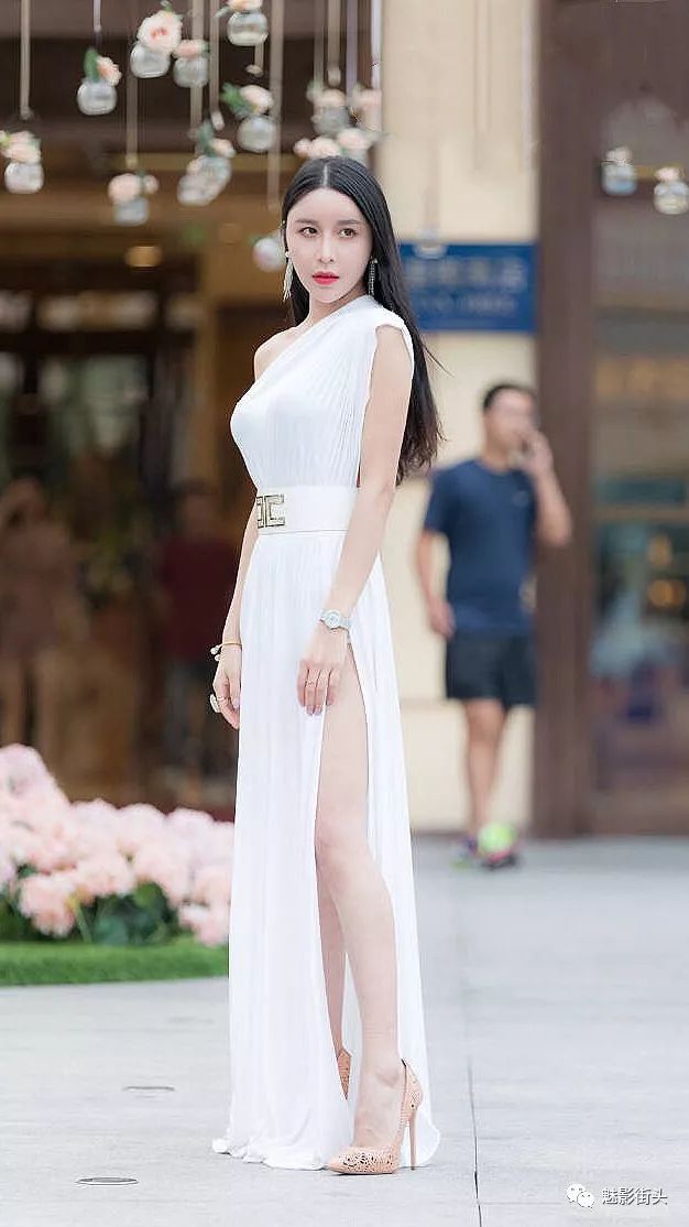 这个美女白皙的肌肤就像寒冬了的雪一样白,白里透着红,用肤如凝脂来形容是最恰当不过的了。美女穿了一条纯白色的连衣裙,采用了斜肩设计,露出一侧的香肩。裙身一侧采用了高开叉设计,搭配一双裸色尖头高跟鞋,鞋跟至少10厘米以上,这样的高跟鞋挺拔身姿的效果非常出众,也展示了美女女神般的气质。