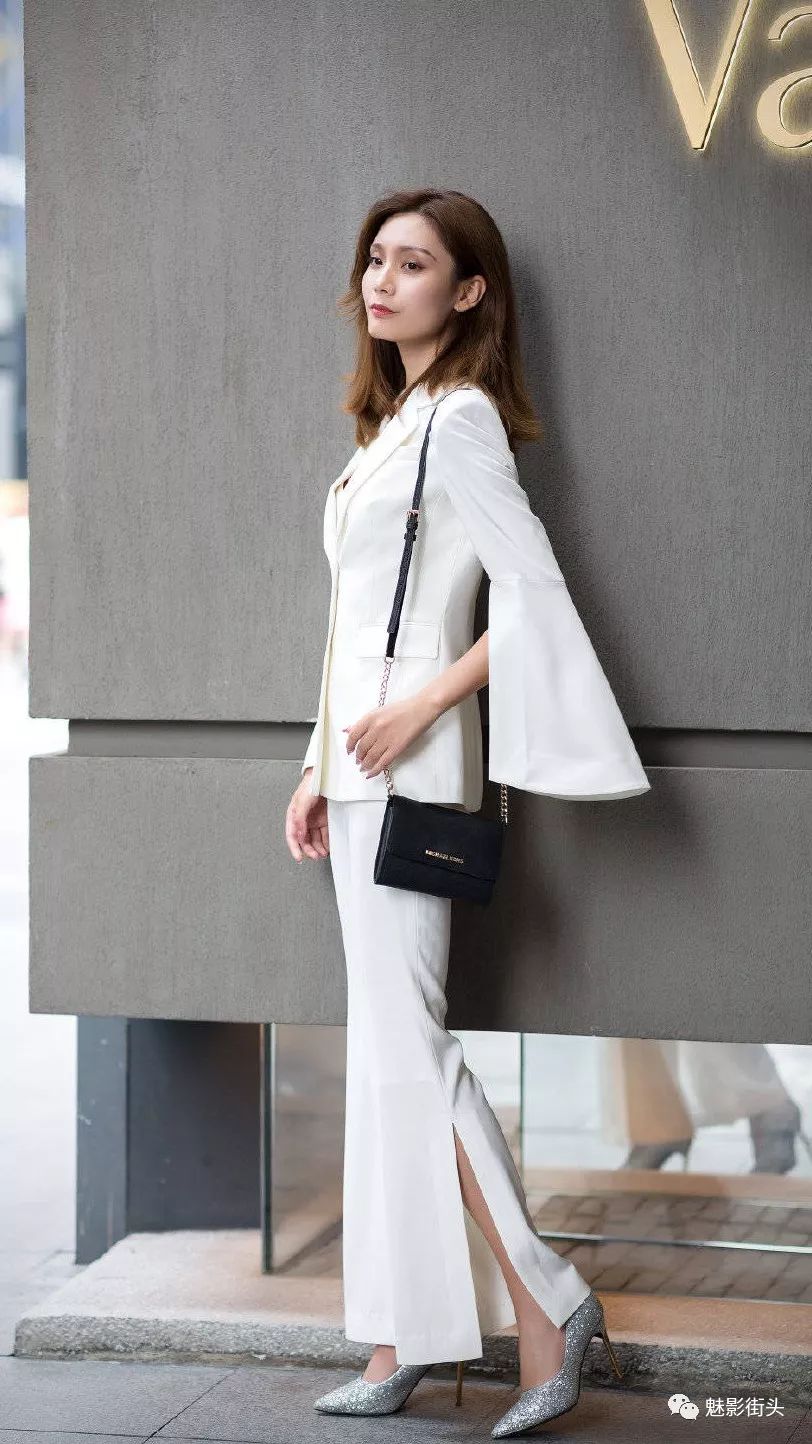 这位美女穿了一套白色西服套装,是一款充满了时尚气息,又带着一丝休闲味的休闲西装,纯白色的面料,手袖是马蹄袖加开叉设计,裤腿同样也采用了开叉设计,现在很多服饰都加入了开叉设计,来凸显女性的优雅气质。美女搭配了一双银灰色的尖头高跟鞋,让整个人的气质又多了几分职业女性的魅力。