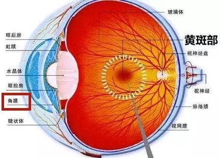 眼角膜是眼睛最前端一层透明的纤维膜,覆盖虹膜、瞳孔和前房。眼角膜上具有十分丰富的神经末梢,对痛觉和触觉尤为敏感。它是重要的屈光间质,可让光线进入眼睛,并对光线进行折射让其投射在视网膜上形成影像。