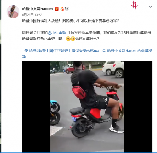 NBA火箭队的当家球星哈登近日来到上海,这一消息已经在微博上轰炸了好几波了,尤其是他骑着红色小牛电动车在上海刷街的视频更是被疯传。哈登的粉丝甚至更加疯狂,直接喊话网友抽同款红色小电驴,话说哈登粉丝团是不是有点太宠登哥了?