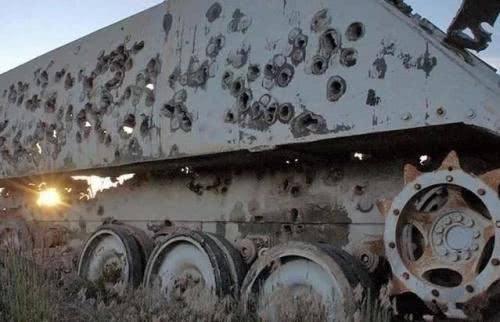 (20毫米火神机炮击穿的废旧坦克侧装甲)