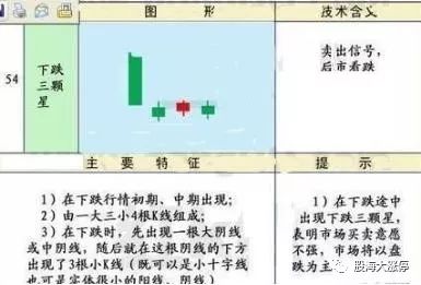 1、在下跌途中出现下跌三颗星,表明市场买卖意愿不强,市场还有进一步下探的空间,后市多以盘跌为主。