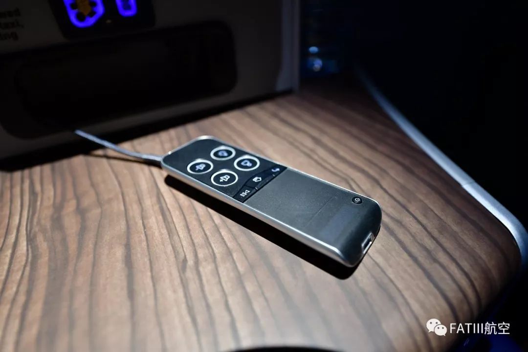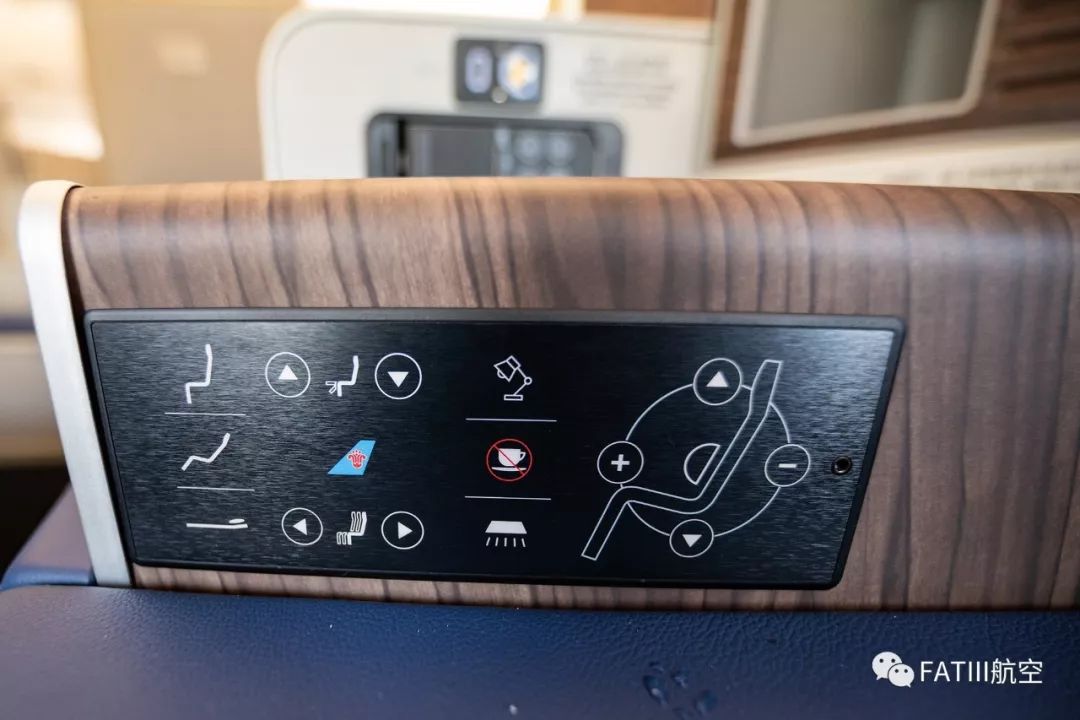 木纹边桌上突起的一块放置的是耳机插孔、USB 接口和很简洁的娱乐系统控制器。座椅控制面板位于木纹边桌内侧靠近扶手处,由于扶手可以收放,即便躺下后控制座椅也较为方便。不过平躺和坐正姿势没有采用一键到位设计,从坐正到平躺需要一直按压平躺按钮,时间有点长。