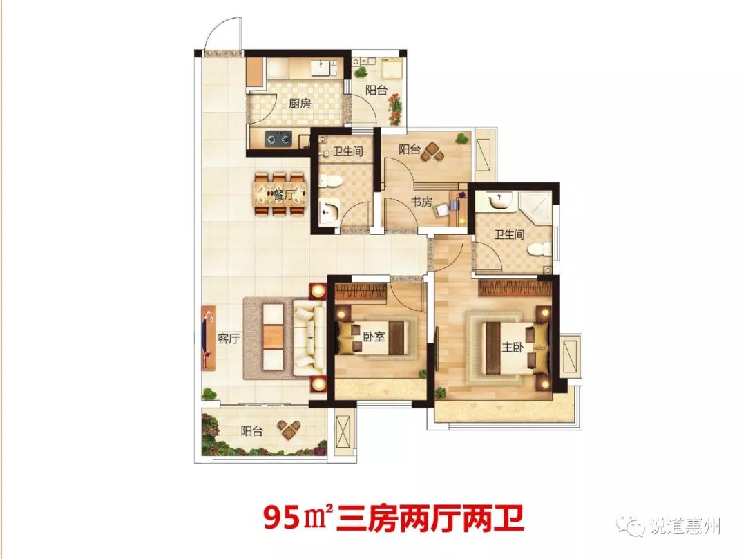 户型:95-117㎡ 高拓户型,贴心预留设计超大鞋柜收纳空间,户户朝南,方正实用,超高使用率,双景观阳台,随享湖山美景,主卧套房设计,更加私密舒适