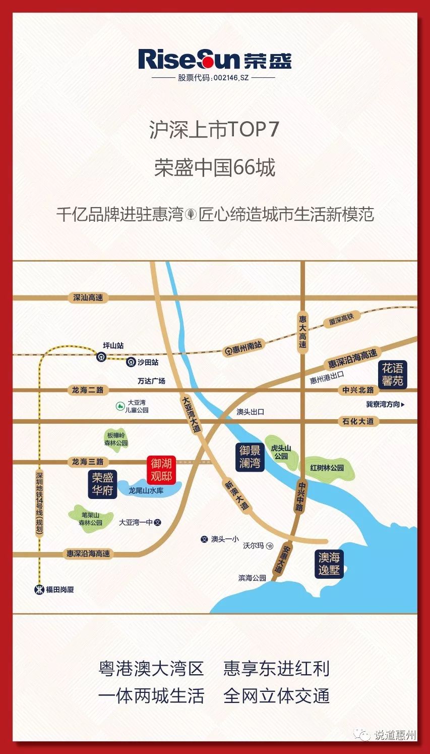千亿上市房企,实力保障:荣盛发展,上市11年,24年66城200余盘,加速崛起,升级为集“大地产、大健康、大金融、互联网+”等业务为一体的多产业综合集团。稳步拓展“京津冀”、“长三角”、“珠三角”都市圈。2016年首进惠湾,目前拥有御景澜湾、花语馨苑、荣盛华府、御湖观邸、澳海逸墅五大项目