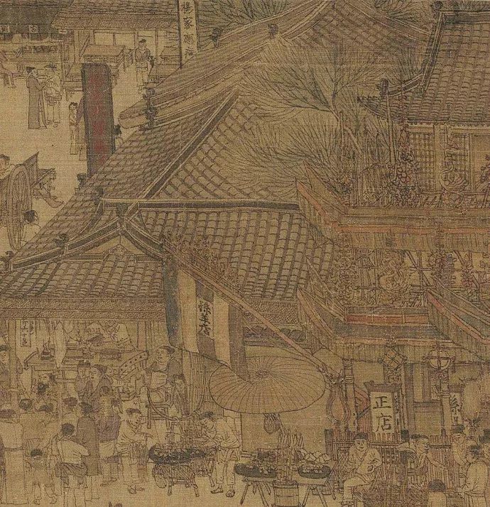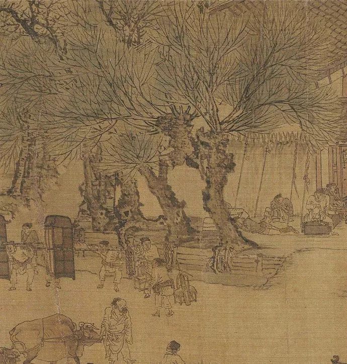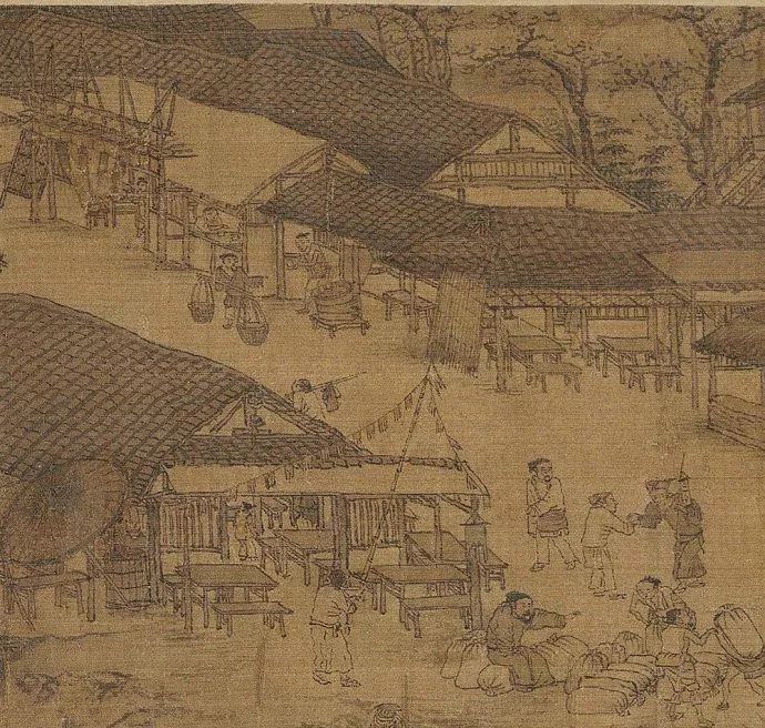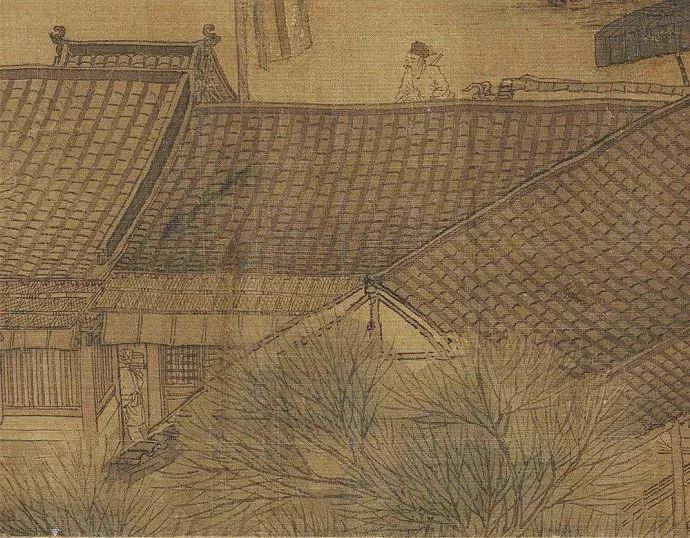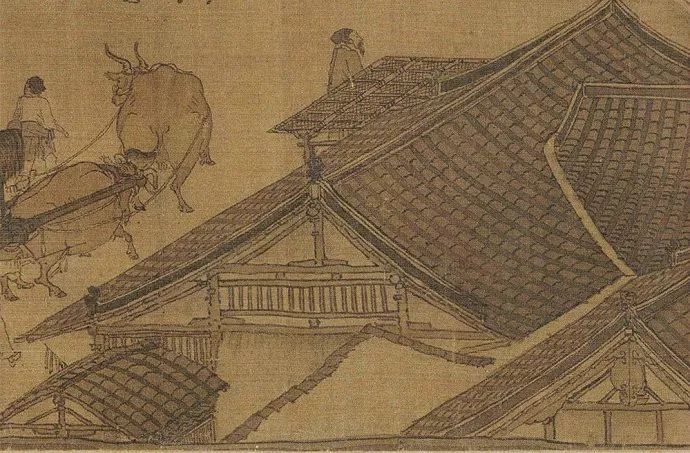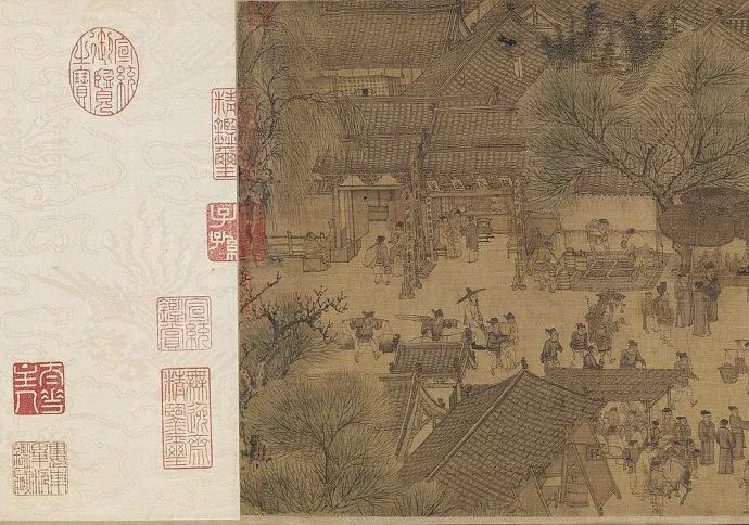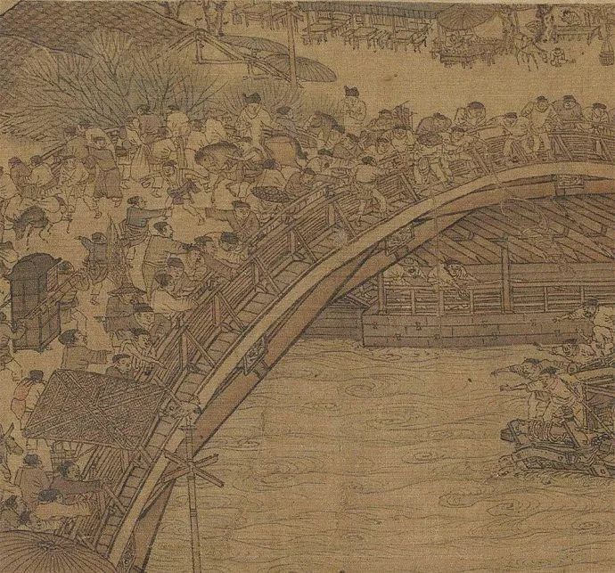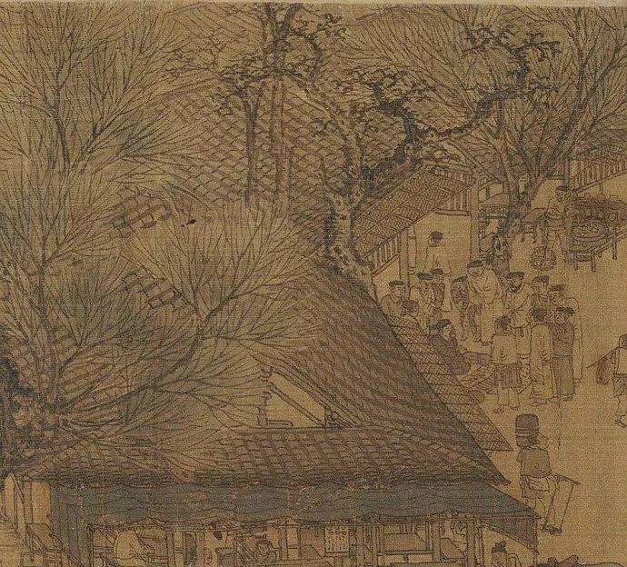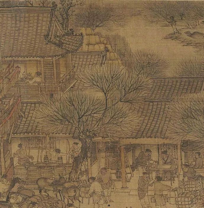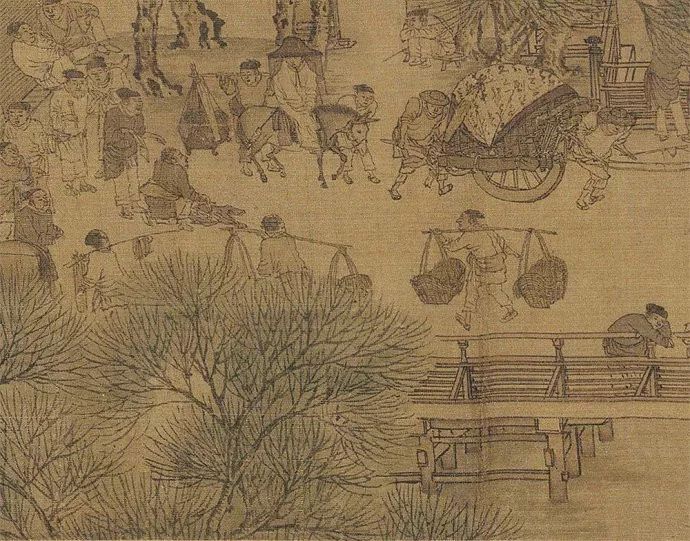 比消防缺失更可怕的是城防的涣散。画中,城墙上下没有一个守卫,土墙上面也没有任何城防工事,连射箭的城垛也没有,甚至连虚设的城防都没有。原本应该是有重兵把守的城防机构所在的位置,居然是一家商铺,老板正在验货,账房在记账。从画面上看,整个汴京正沉浸在浓厚的商贸气氛中,完全是一座不设防的都城。这不是张择端的有意设计,而是真实地反映了宋徽宗朝初期已日渐衰败的军事实力和日趋淡漠的防范意识。