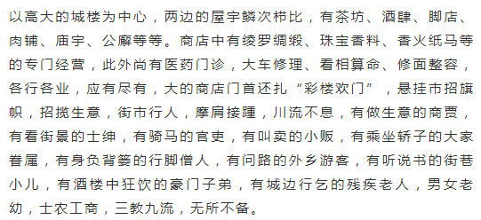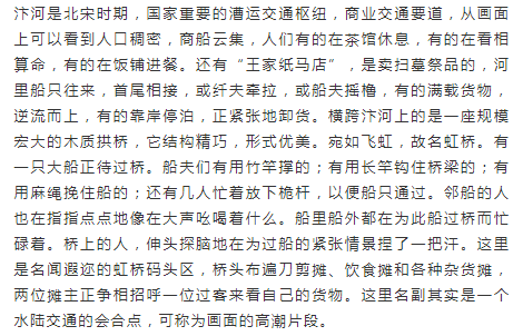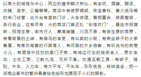 交通运载工具:有轿子、骆驼、牛车、人力车,有太平车、平头车,形形色色,样样俱全,把一派商业都市的繁华景象绘色绘形地展现于人们的眼前。