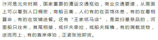 上游不远处已有几艘船依次泊在岸边,主航道中有两艘船在航行,橹工的汴河号子与纤工的汴河号子两首和声合唱回响在空中,渐渐的远去,渐渐远去,这些人文的场景与秀丽的河山形成了一副美丽风俗画面,所以一些文人雅士、达官贵人要找寻的好地方,在对岸的河湾缓冲区,商人不失时机的安置了两条游船,让他们在上面饮酒唱茶,欣赏汴河的风景。