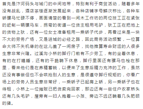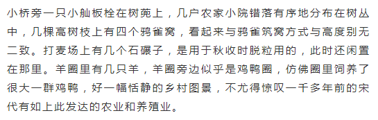 轻轻打开此图,见小溪旁边的大路上一溜骆驼队,远远的从东北方向汴京城走来、五匹毛驴负重累累,前面的马夫把领头的牲畜赶向拐弯处的桥上,后面的驮夫用马鞭把驮队驱赶向前,目的地快要到了,从驮工熟练的驾驿着驮队的神情就知道他们是行走多年的老马帮了。