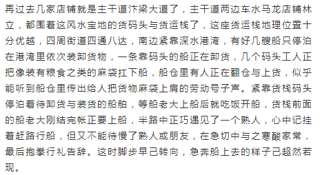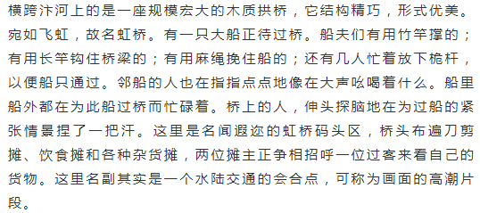 码头上还有不少人向客船上招呼,他们是迎接自己家人或亲朋好友的,有的还上了虹桥,借虹桥的高度招呼,以便早点见到亲人,旁边一只小一点的客船上也有人挥手呼喊,那是在招揽生意,呼唤需要到分河航道码头的客人,可以想见当时汴河流域的交通多么发达,水旱各路构成了很大的客运货运交通网络。