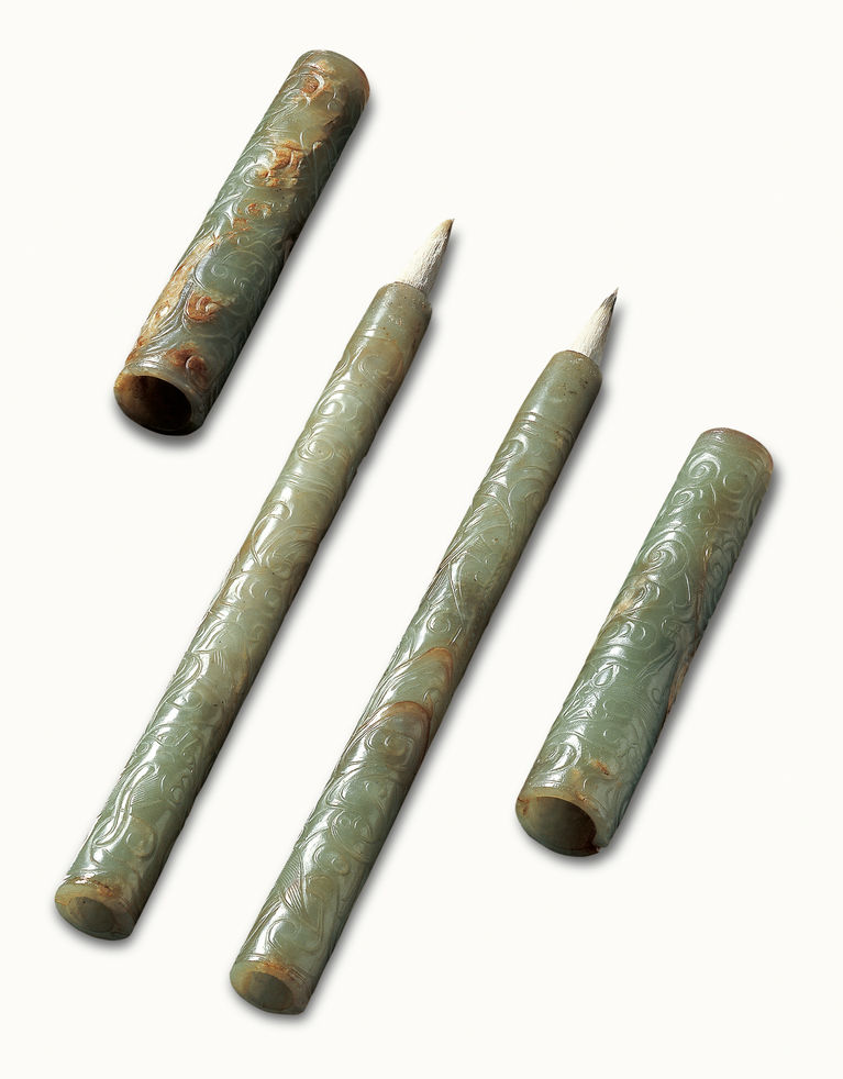 青玉云螭纹笔 笔为一对,有帽,杆中空,阴刻云螭纹。目前,传世玉笔最早见于明代,数量少,成对出现,更为难得。明代玉质文房用具以苏州产最负盛名。