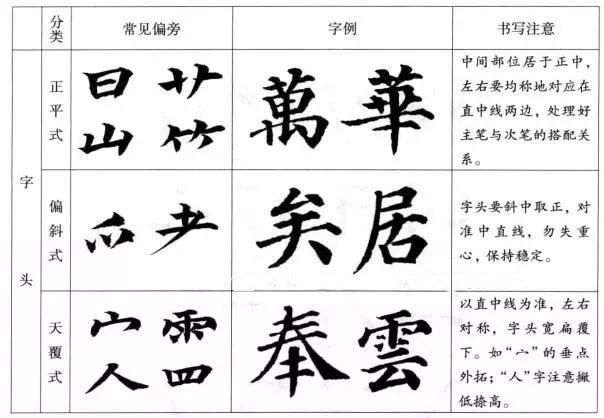 (1)字头:在一个字中起着“定字位”、“定中心”的作用。安排不当就会造成体势不正的毛病。分“平正式”、“偏斜式”、“天覆式”、“分张式”四种。