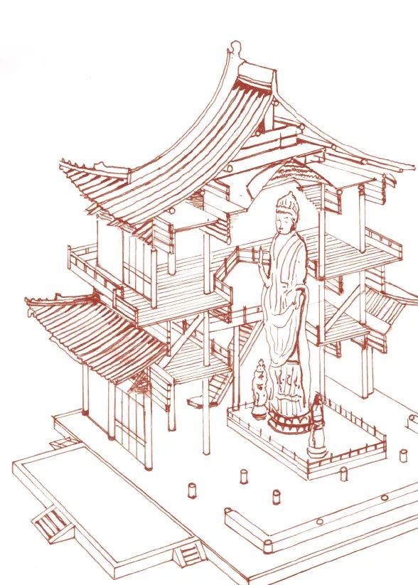 穿过山门后,主体建筑观音阁即全部展现于我们面前,观音阁外观二层实为三层,面阔五间,宽约20 米,高约23 米,歇山顶出檐深远,整体形象稳重而舒展,似乎有种唐风遗韵。观音阁内立有28 根立柱,使内部空间分为内外两圈,中部天井以十一面观音像与两侧的胁侍为中心。考据亦为辽代原物,“统和重塑,尚具唐风,其两旁侍立菩萨与盛唐造像尤相似,亦雕塑史中之重要遗例也”。观音阁内设梯级,共有三层,使人能从不同的高度瞻仰佛容,塑像顶部的天花还覆有斗八藻井,整个内部空间都和塑像紧密结合在一起。现今,为了保护观音阁,普通人已无法登临阁上。梁公曾在《蓟县观音寺白塔记》中记述:“登独乐寺观音阁上层,则见十一面观音,永久微笑,慧眼慈祥,向前凝视,若深赏蓟城之风景幽美者。”我们只能在前人的言语之间,感受一下站在阁上的感觉。在观音阁下层的四壁上还绘有十六罗汉立像和三头六臂或四臂的明王像,其间穿插有山水和世俗题材的彩画,虽为明代遗作,但画面清楚且色泽鲜明。1976 年7 月,唐山大地震导致独乐寺院墙倒塌,观音阁虽墙皮部分脱落,但其梁架未见歪闪,足见始建于辽代的观音阁结构之合理性。