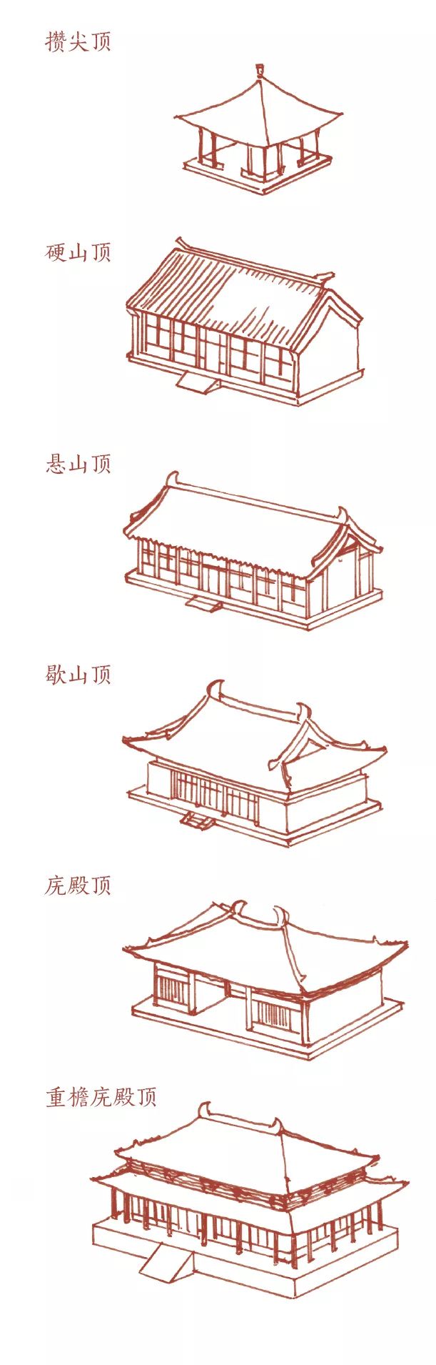 除了庑殿顶、歇山顶这些等级比较高的屋顶形式,常用的屋顶样式还有悬山顶和硬山顶。悬山顶是两坡顶的一种,也是我国一般建筑中最常见的形式,其特点是屋檐两端向两山墙以外伸出( 故又称为挑山或出山)。悬山一般有正脊和垂脊,较简单的仅施正脊,也有用无正脊的卷棚。山墙处常露出木构架的柱、梁或枋。悬山屋顶在汉画像石及明器中仅见于民间建筑,已知实物最早的为山东肥城孝堂山汉代的郭巨墓祠。除了悬山顶,硬山顶也是两坡顶的一种,但与悬山顶不同的是,屋面两侧不悬出山墙之外,且其山墙大多用砖石砌筑,并高出屋面。硬山顶在宋代已经出现,后来成为一种广泛分布的屋顶样式,似与砖产量的大幅增加有着直接的关系。