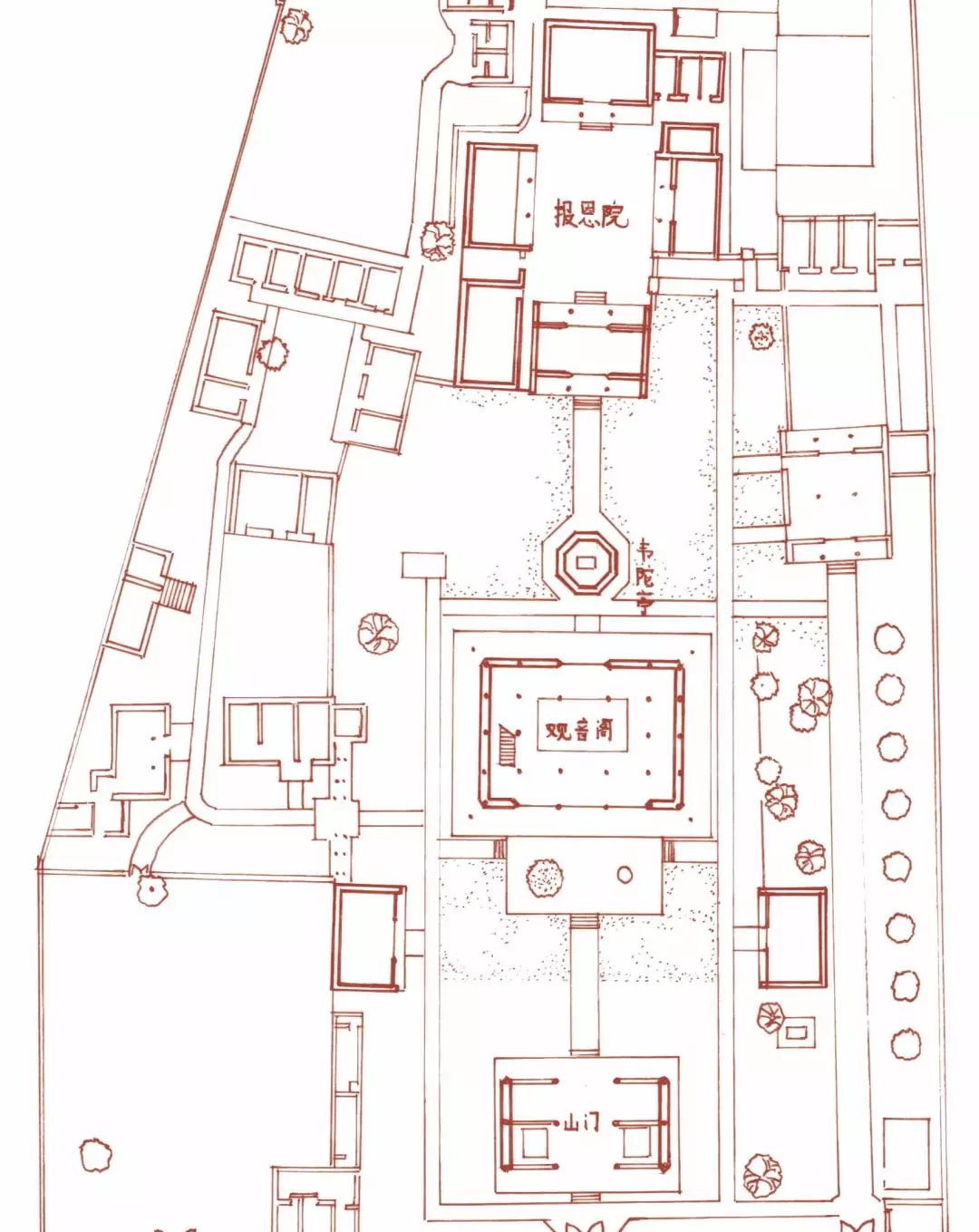 外围高高的围墙依旧保持着独乐寺神秘的氛围。寺院早期的总体布局以及规模早已难以查证,目前主轴线上存有山门、观音阁、东西两侧的配殿,以及阁后的韦陀亭和东北角的三间小殿( 清帝谒东陵中途的行驻之处)。占地约有10000 平方米。