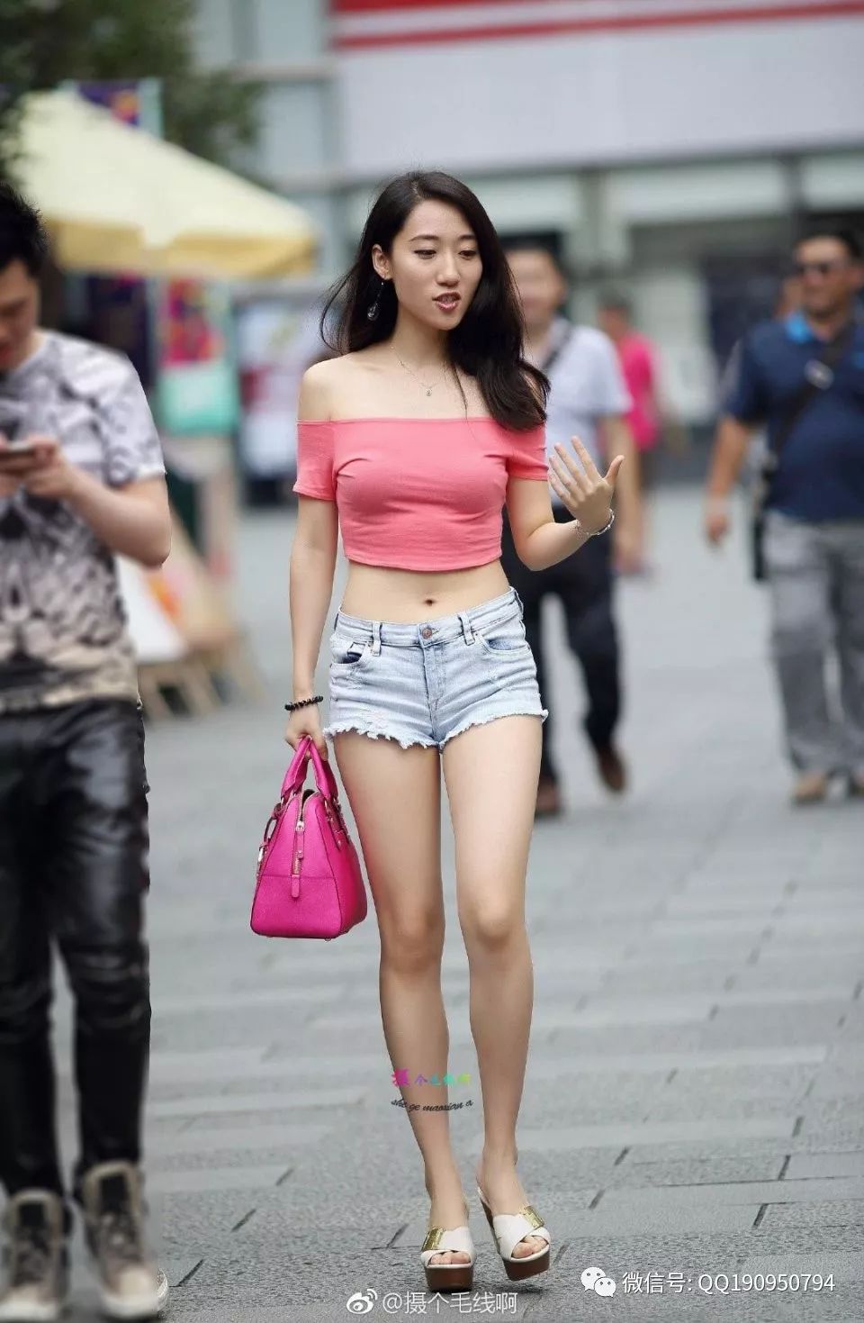 街拍:小姐姐一字肩短裤出街,少女肌和草莓包包都想求个同款