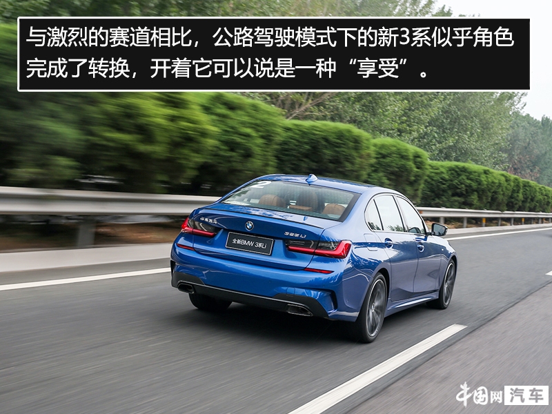 与激烈的赛道相比,公路驾驶模式下的新3系似乎角色完成了转换,开着它可以说是一种“享受”。首先油门踏板、刹车踏板的调校风格会让你觉得很舒服,既没有SPORT那么激进,也绝不会像ECO模式那么“柔软”,都可以很好的按照你预期的那样去完成对于加速或制动的诉求,并且足够线性。另外底盘方面依然具备高水准,无论是噪音还是震动都很少的传递到车厢内,可以给乘客带来更舒适的乘坐感受。