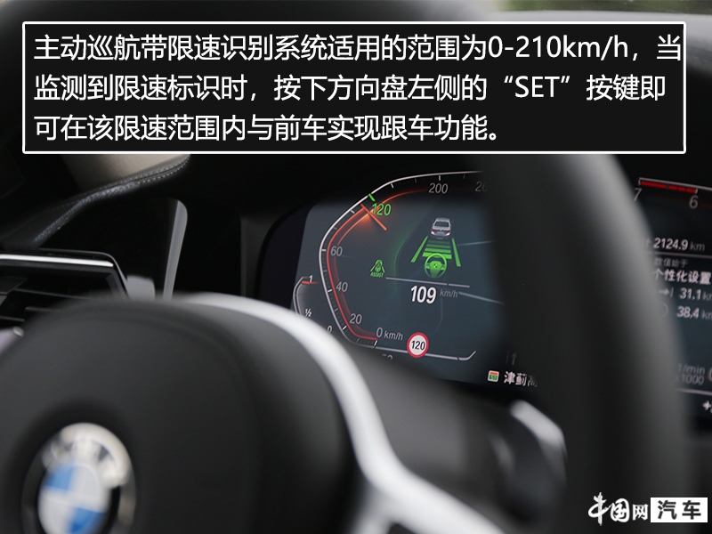 主动巡航带限速识别及车道保持辅助系统在高速路行驶时会非常好用,该功能可通过方向盘的左侧按键开启,能在0-210km/h的速度区间内帮助车辆在既定车道内自动行进,记者在第二天的高速路段试驾中几乎全程开启该功能,当监测到限速标识时,按下方向盘左侧的“SET”按键即可在该限速范围内与前车实现跟车功能,长途驾驶会非常省心,智能化程度非常高。