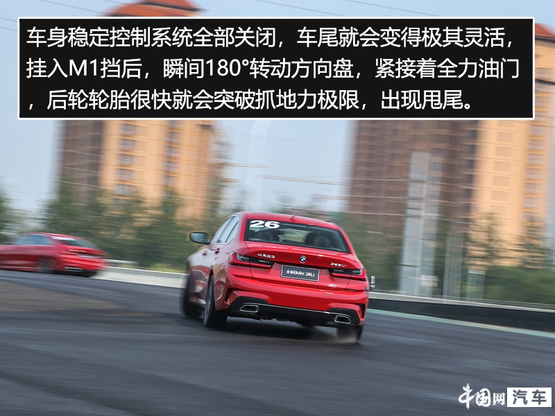 当长按OFF键3秒,可以让车辆进入DSC OFF状态,此时车身稳定控制系统将全部关闭,车尾就会变得极其灵活,挂入M1挡后,瞬间180°转动方向盘,紧接着全力油门,后轮轮胎很快就会突破抓地力极限,然后就会出现甩尾,此时快速反打方向盘360°(对转向过度进行快速修正),一个简单的漂移动作就完成了。这也是记者第一次完成简单的漂移动作,这种感觉着实会让人“上瘾”。