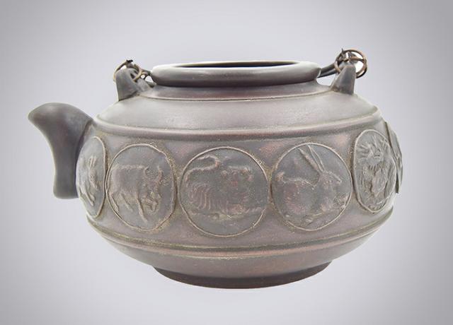 此壶所用泥料质地细腻,淘澄凝练,表皮平滑,平口,圆鼓腹,壶身造型圆润丰满,呈现出匀称丰腴的宝相。壶嘴细长有力;盖上圆钮虽小仍与壶身统一。壶身表面整有十二个生肖动物,体点、线、面处理圆融流畅,淳朴古雅。壶身虽小,但以矮圈足支起使得全器显得式度不凡。