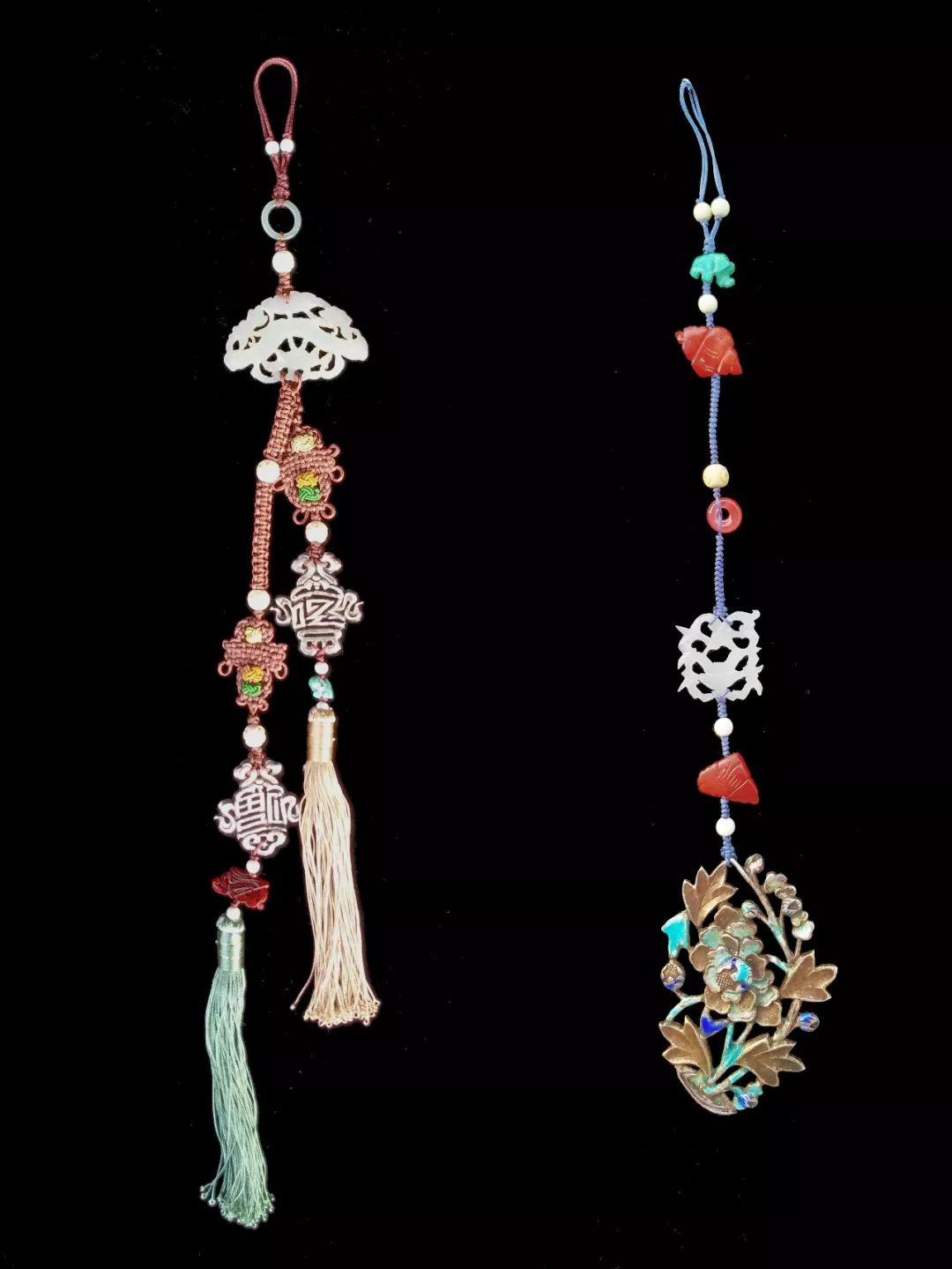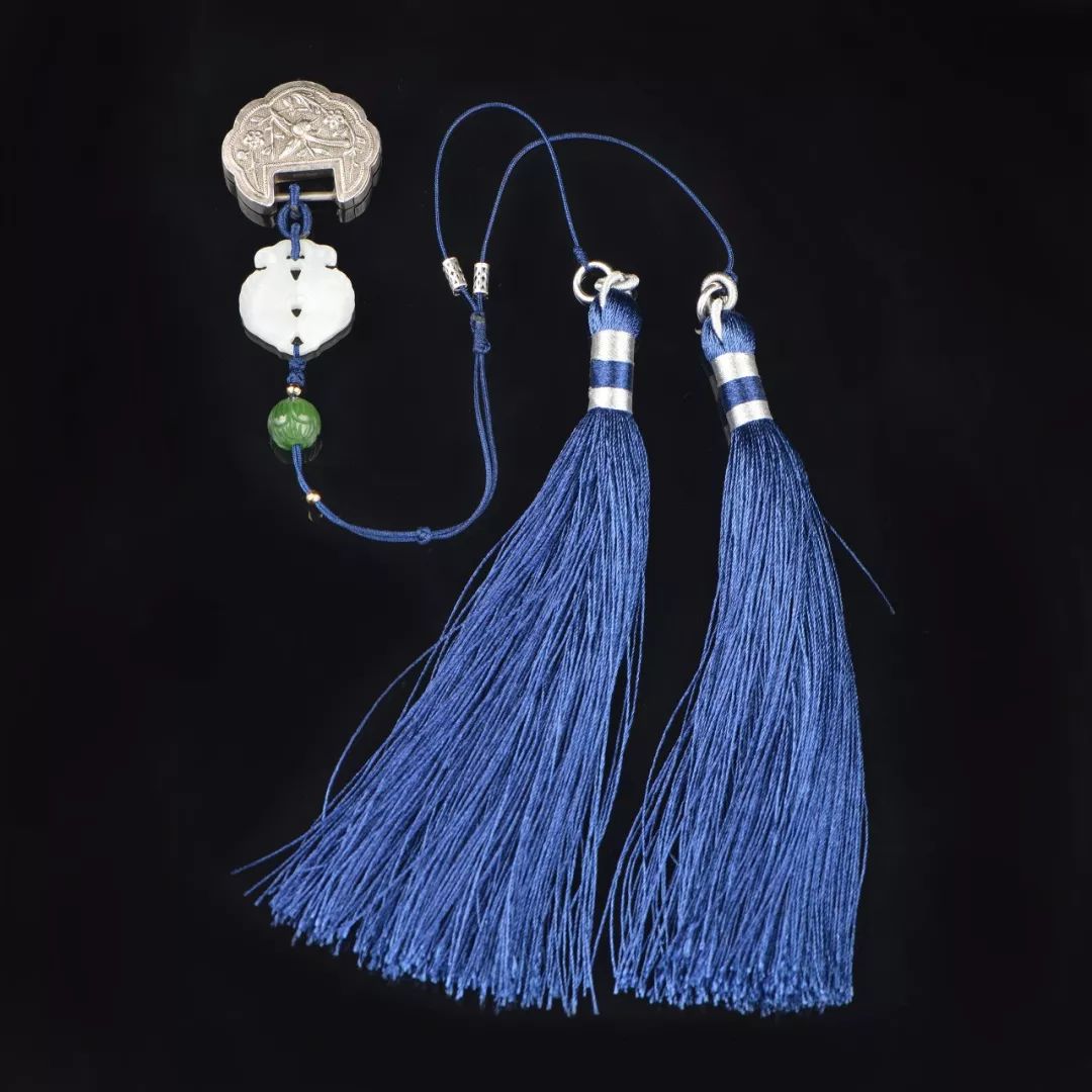 以老银锁、白玉双鱼、翡翠和现代绳艺创作的压襟