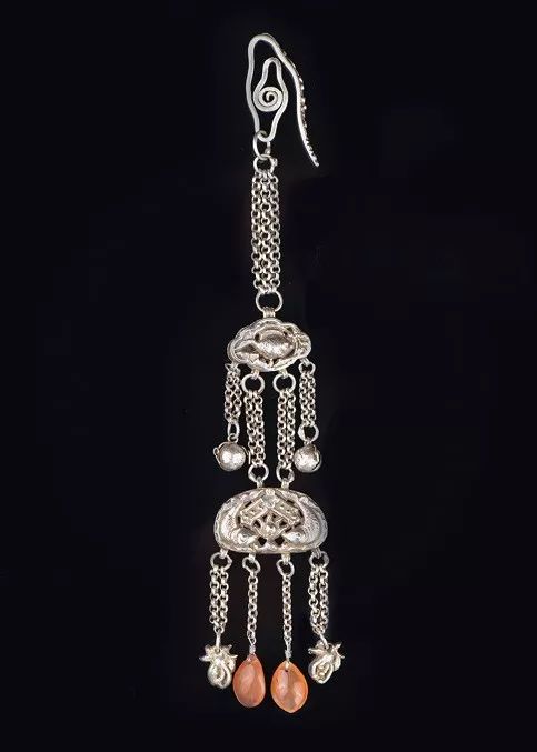 说到压襟的起源,可以追溯到腰挂。腰挂在唐代又名“蹀躞带”,是文武官员必佩之物,俗称“蹀躞七事”,即悬挂算袋、刀子、砺石、契苾真、哕厥、针筒、火石袋等七种物品。以后佩饰风气在民间广为流行,品种更为多样,男子多悬挂小型武器及点火用具,女人则佩戴针筒之类生活用具。
