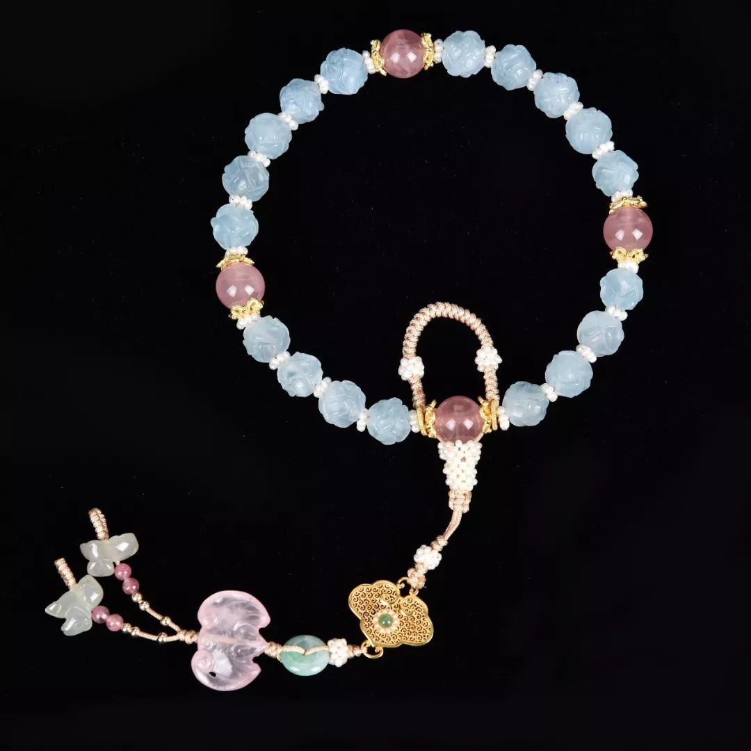 如果你去台湾故宫博物院,就会在“后妃首饰”的陈列中,看到缤纷多彩的各色十八子:粉色碧玺的鲜嫩,绿色翡翠的艳丽,伽南香珠的低调奢华……而十八子的美,不仅仅在它的珠子上,更在它每一个配件的讲究,三通,佛头,挂绳的颜色,以及上面垂挂的小配件,无一不经过精心的搭配和精选。