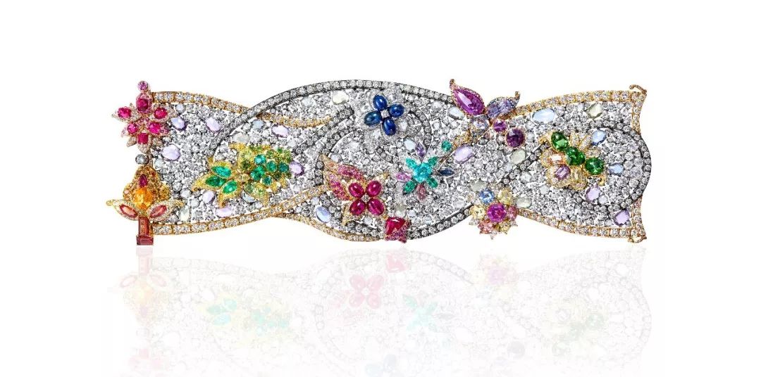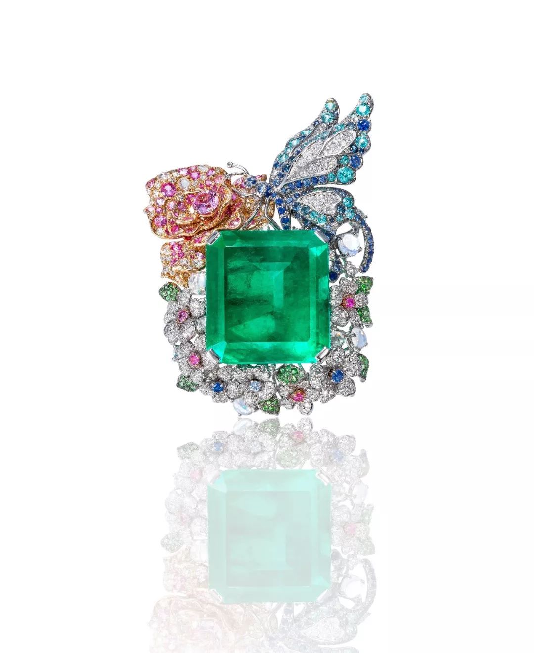 以43.83克拉祖母绿为主石,搭配月光石、彩色刚玉、玫瑰式及圆形明亮式切工白钻镶嵌而成,共计54.21克拉。蝴蝶在春日的玫瑰花园中嬉戏,仿若一首祥和宁静的十四行诗,歌咏着风和日丽的宁静午后。