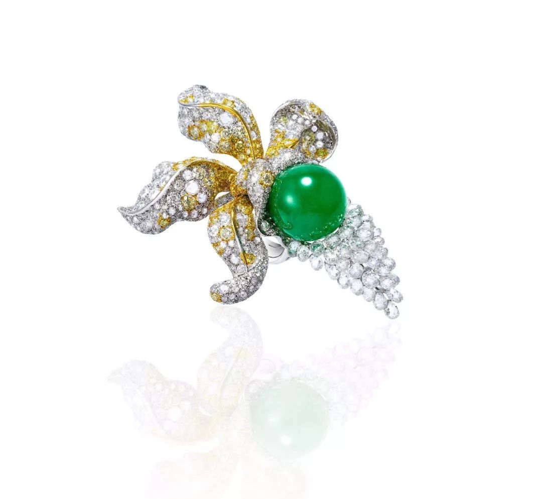 以52.04克拉翡翠为主石,搭配黄钻、briolette 切工、玫瑰式及圆形明亮式切工白钻镶嵌而成,共计84.81克拉。艳丽的黄钻围绕翡翠,贵气逼人的兰花顷刻间于指尖绽放。