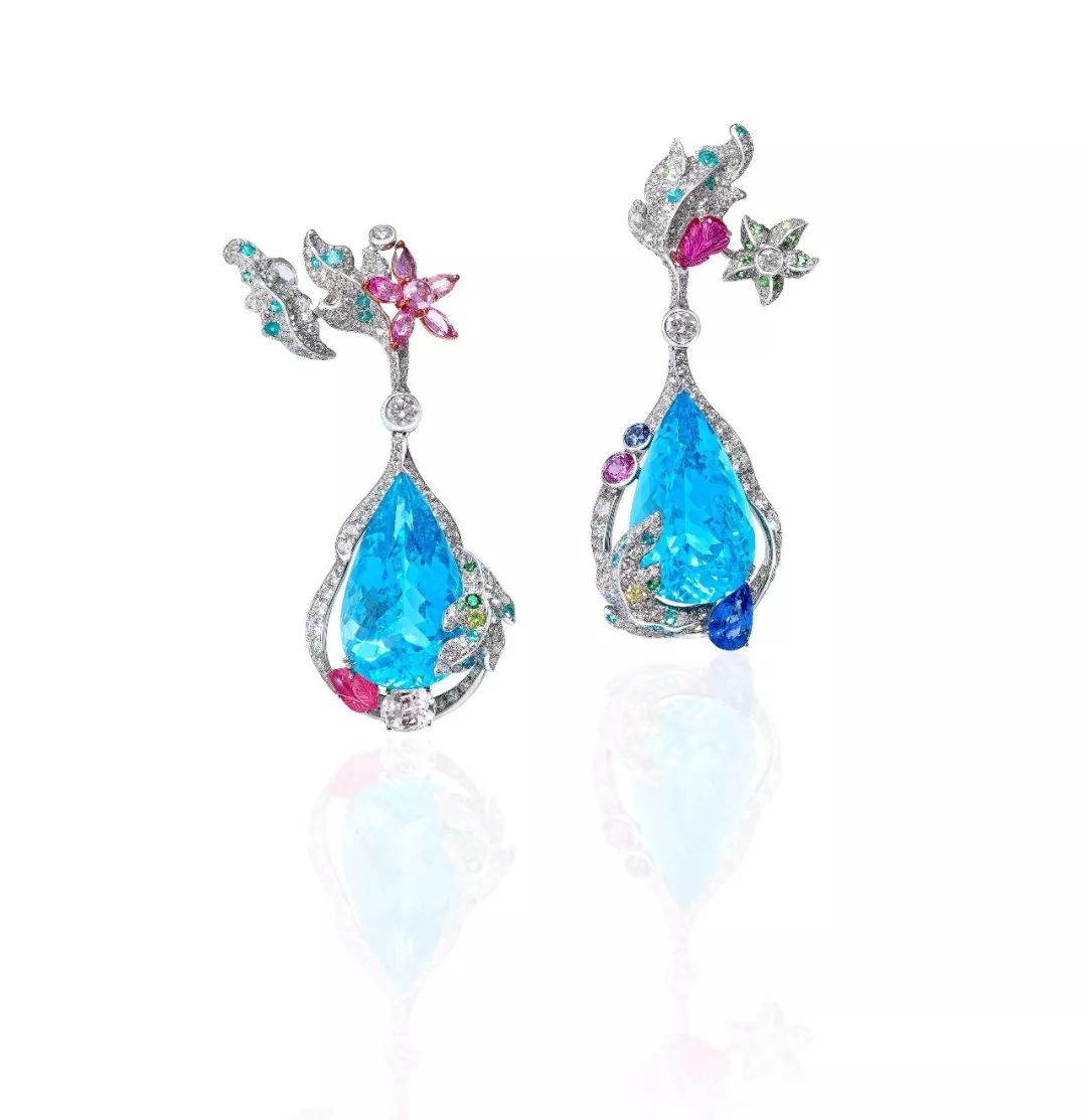 以两颗共49.02克拉海蓝宝为主石,搭配彩色刚玉、黄钻、玫瑰式及圆形明亮式切工白钻镶嵌而成,共计63.25克拉。海草及海星在澄澈的海蓝宝周围舞动,呈现欢腾的海底世界景象,仿佛能在耳尖听到海浪的徐徐波动。