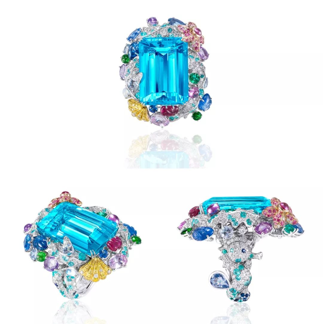 以33.17克拉海蓝宝为主石,搭配彩色刚玉、月光石、黄钻及圆形明亮式切工白钻镶嵌而成,共计50.42克拉。缤纷的彩宝构成了欢乐活泼的水底世界,澄净的海蓝宝则为指尖注入一股夏日的清凉。