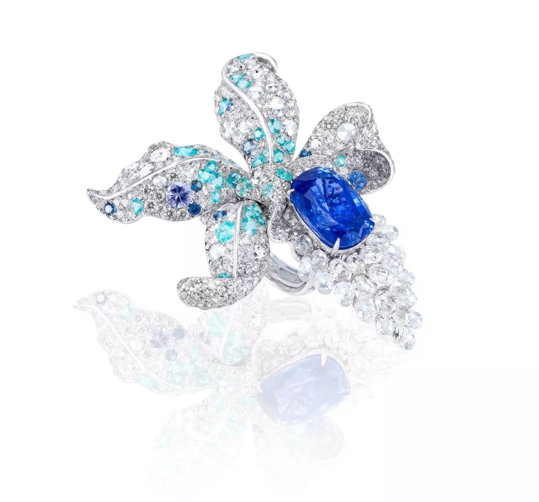 以8.15克拉蓝宝为主石,搭配帕拉伊巴碧玺、蓝宝、briolette 切工、玫瑰式及圆形明亮式切工白钻镶嵌而成,共计22.95克拉。蓝宝主石所构成的花蕊,由青色花瓣所环绕,神秘中透露一股清澈,仿若静谧森林里一抹清香正扑面而来。