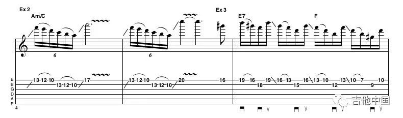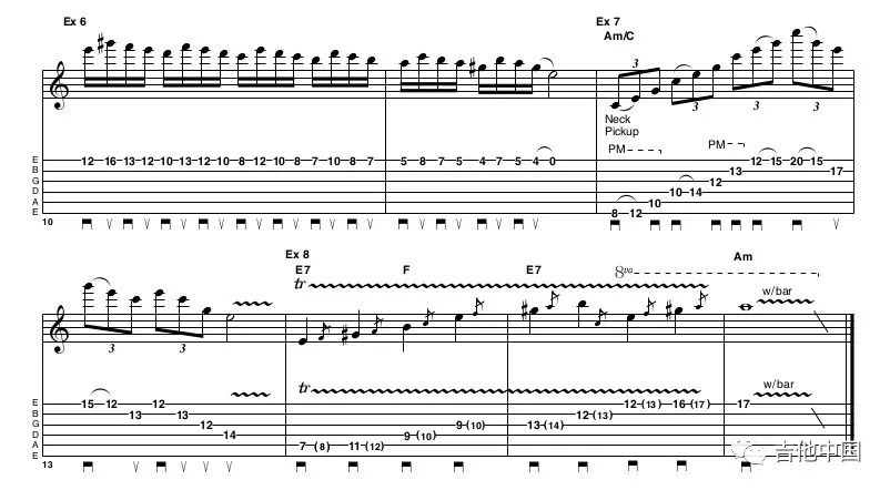 在Yngwie的演奏中经常会出现按照音阶顺序上或下的拨弦方式。只看谱子的话并不难,但是如果你在160BPM的情况下演奏16分音符就是另一种情况了。