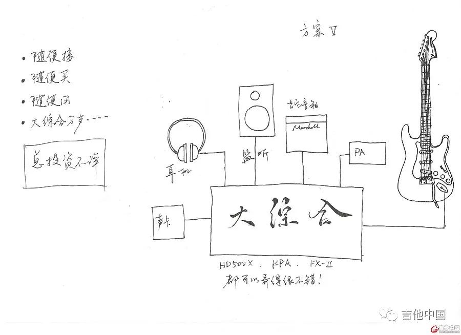 2、这八种方案的思路都是一样的,吉他——激励器——失真源——周边。