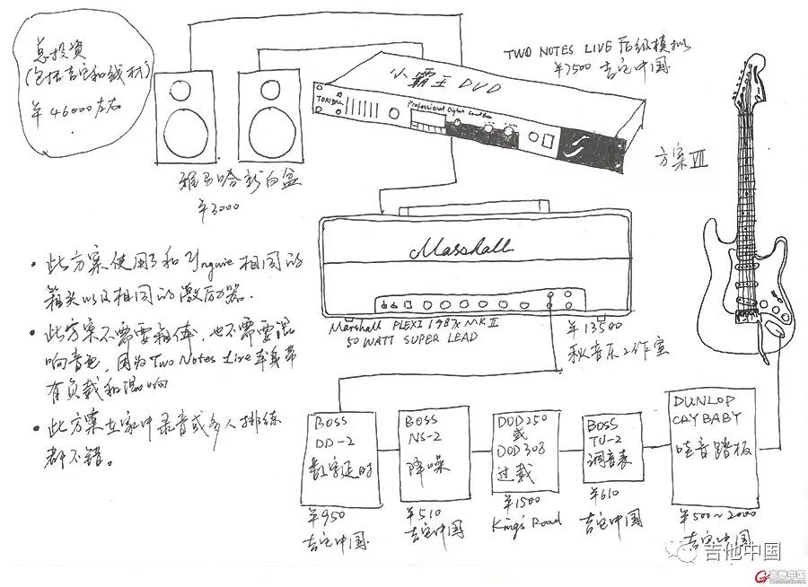 这种方案不仅适合自己练习以及排练,它也同样适合外出在LIVEHOUSE里面演出用,反正武汉的Livehouse基本上都是Marshall管箱标配了。因为有了电子管音箱,它的音色相对于前面几个方案有了质的提升。变得更加温暖有力。加上PLEXITONE失真源的实力,几乎能获得和Yngwie近似程度达到95%的音色。